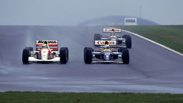The turbocharged Williams ought to have been unrivalled by the McLaren, but Prost's comparative rookie-like appearance in damp conditions gave Senna the advantage.