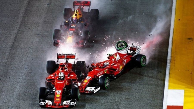 Vlak na de start van de Grand Prix in Singapore, ging het mis voor Max Verstappen en de beide Ferrari-coureurs. Uit de herhalingen bleek dat Vettel risicovol naar links instuurde, waardoor Verstappen klem kwam te zitten tussen de Duitser en Kimi Räikkönen. Hierdoor ontstond er een crash en vielen alle drie de coureurs uit. Ferrari was woedend en slingerde een tweet de wereld in waar de schuld duidelijk bij Verstappen werd gelegd. "Ze mogen twitteren wat ze willen", zei de Nederlander na afloop.