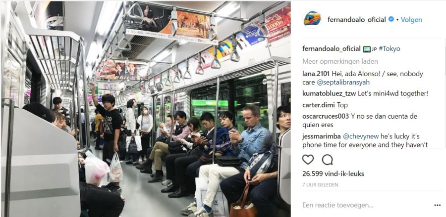 Ondertussen heeft Alonso zich al helemaal vermengd met de Japanners, zo blijkt uit deze foto van hem dat hij gewoon een rondje met de metro heeft gemaakt!