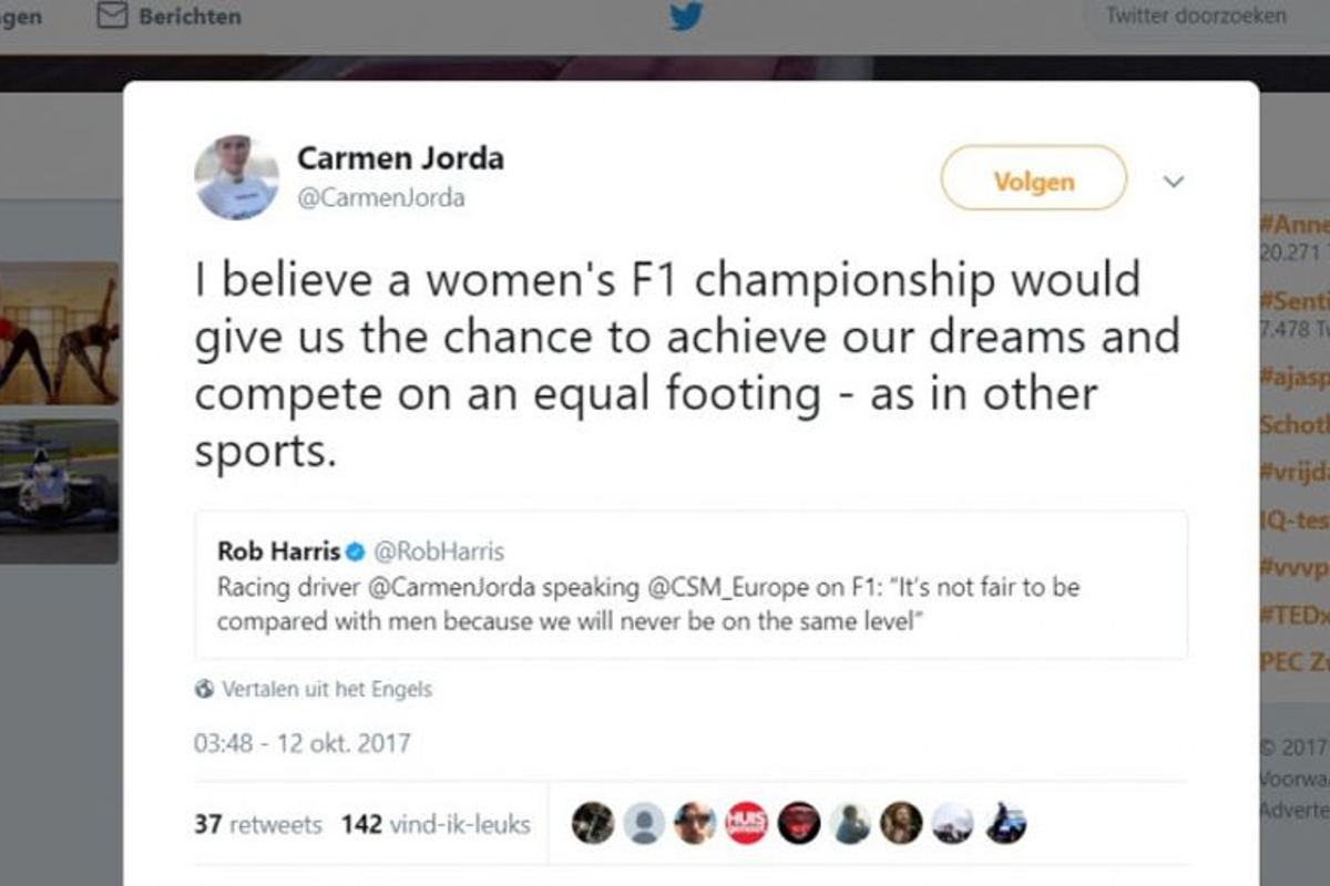I believe a women's F1 championship would give us the chance to achieve our dreams and compete on an equal footing - as in other sports. https://t.co/icPOOEFu8R — Carmen Jorda (@CarmenJorda) 12 oktober 2017