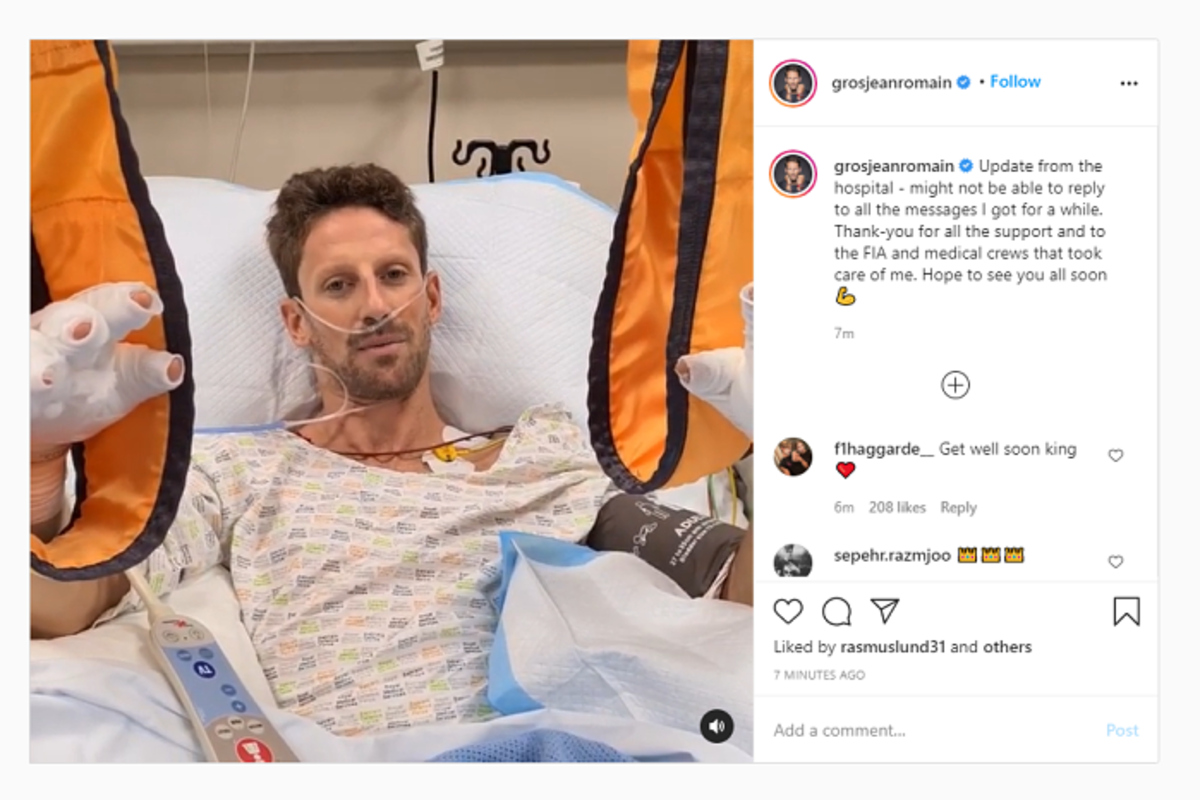 Romain Grosjean heeft na zijn horrorcrash in Bahrein van zich laten horen via Instagram.