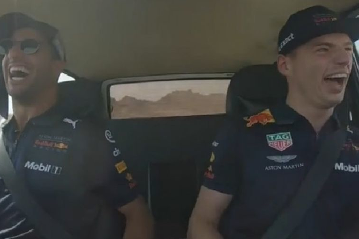 Max Verstappen en Daniel Ricciardo mochten zich met een tot 'RB14' omgedoopte Lada Niva uitleven in de Gobustanwoestijn in Azerbeidzjan. Max kroop op een zeker moment achter het stuur en ging helemaal los, tot groot vermaak van Daniel. Over de walkietalkie werd hij echter snel tot de orde geroepen door iemand van Red Bull, waarna hij snel op de rem trapte!