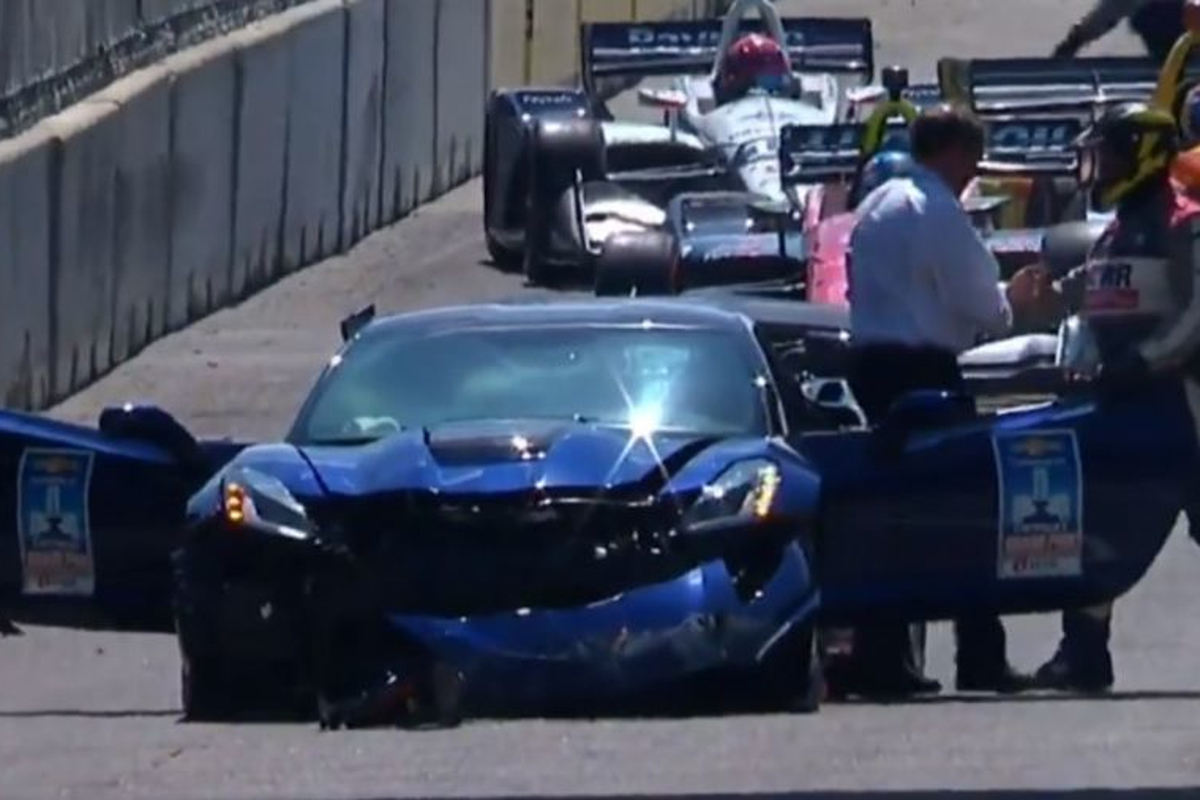 Een heel opmerkelijk moment in de Indy-race in Detroit: daar verloor de bestuurder van de pacecar de macht over het stuur, waarna hij voor het oog van de coureurs de Corvette keihard tegen de muur zette. De klap was hard genoeg om de airbags tevoorschijn te toveren en de neus van de musclecar heeft absoluut betere tijden gekend. Gelukkig stond er nog een reserveauto paraat!