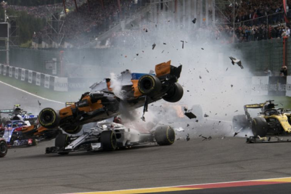 De Grand Prix van België begon gisteren chaotisch. Aanstichter was Nico Hülkenberg die zich verremde. Daarna raakten zo'n vijf coureurs betrokken bij de crash. De auto van Fernando Alonso liep de meeste schade op. Charles Leclerc mocht van geluk spreken dat er een Halo op de auto zit en ook Kimi Räikkönen en Daniel Ricciardo liepen flinke schade op. Bekijk hier de spectaculaire beelden van de startcrash.N.V.T.